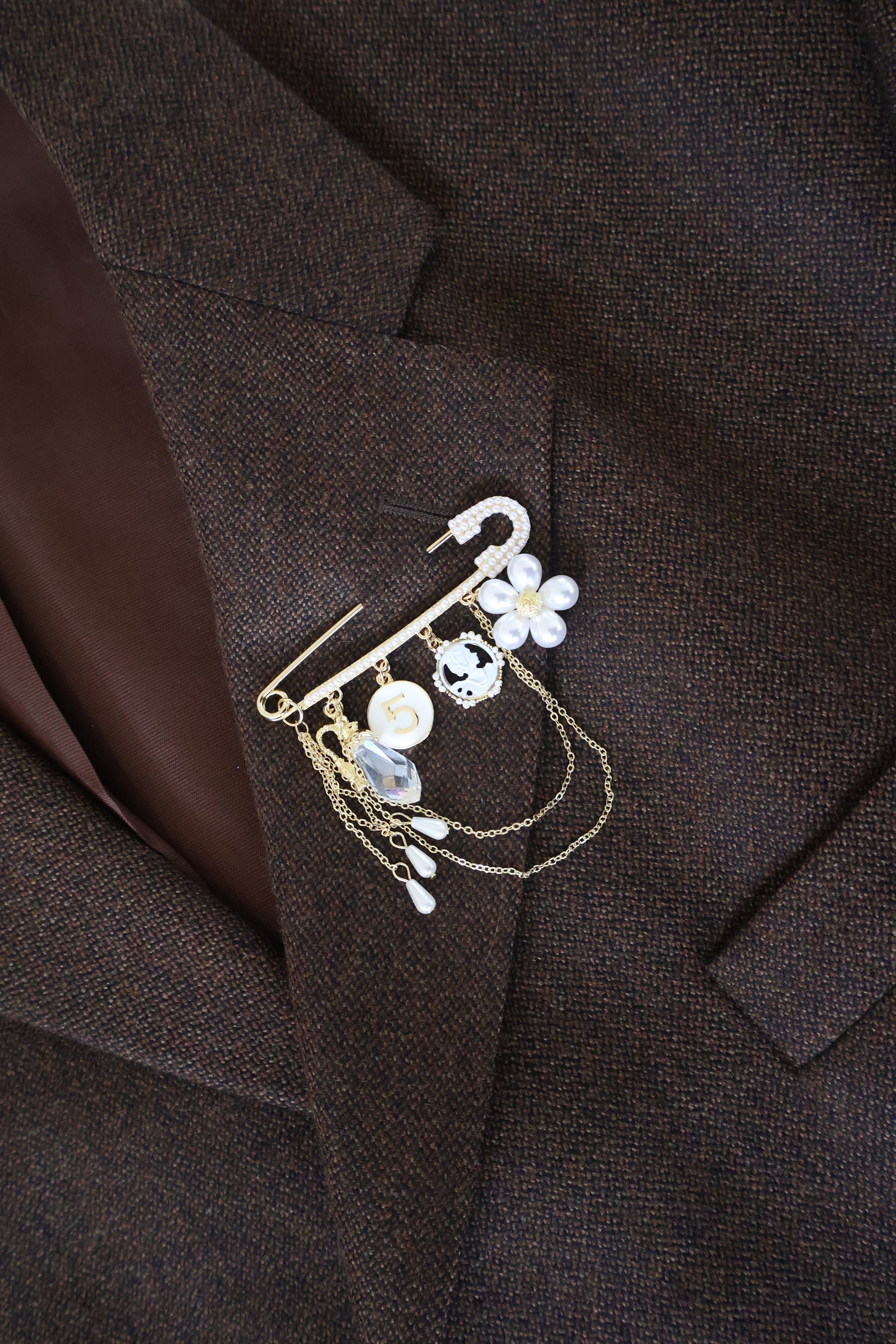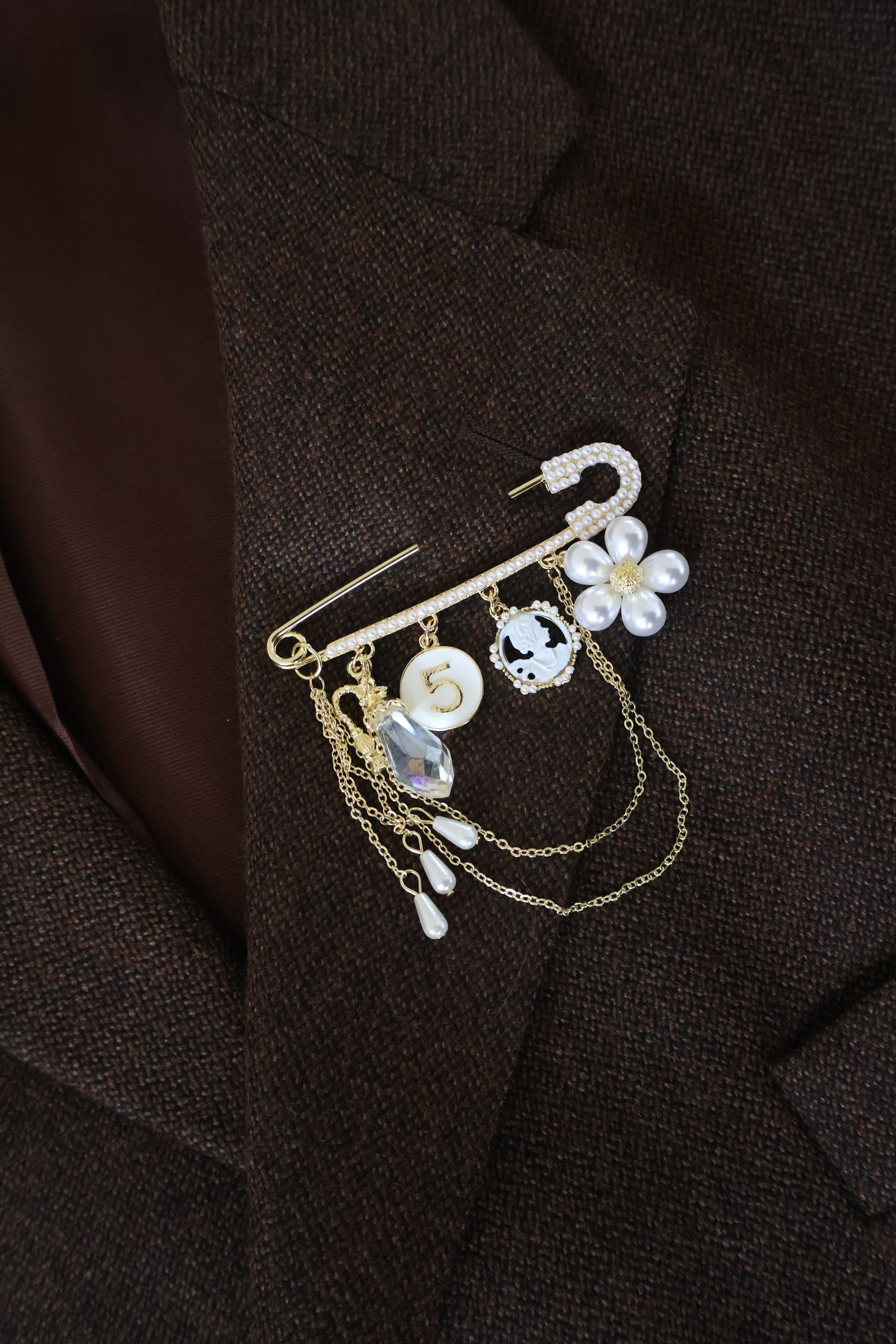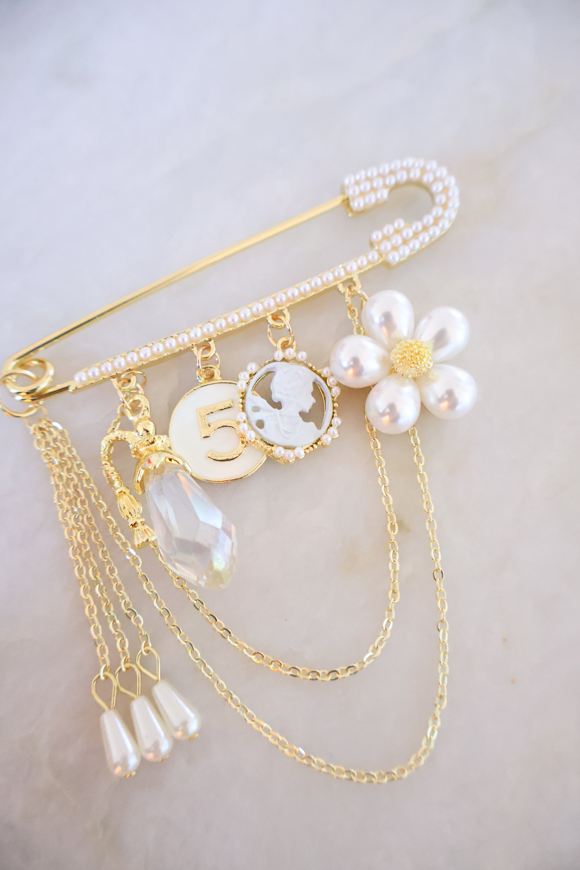Gouden broche pin met bedeltjes. Niet geschikt om op dunne stofjes als katoen te dragen.