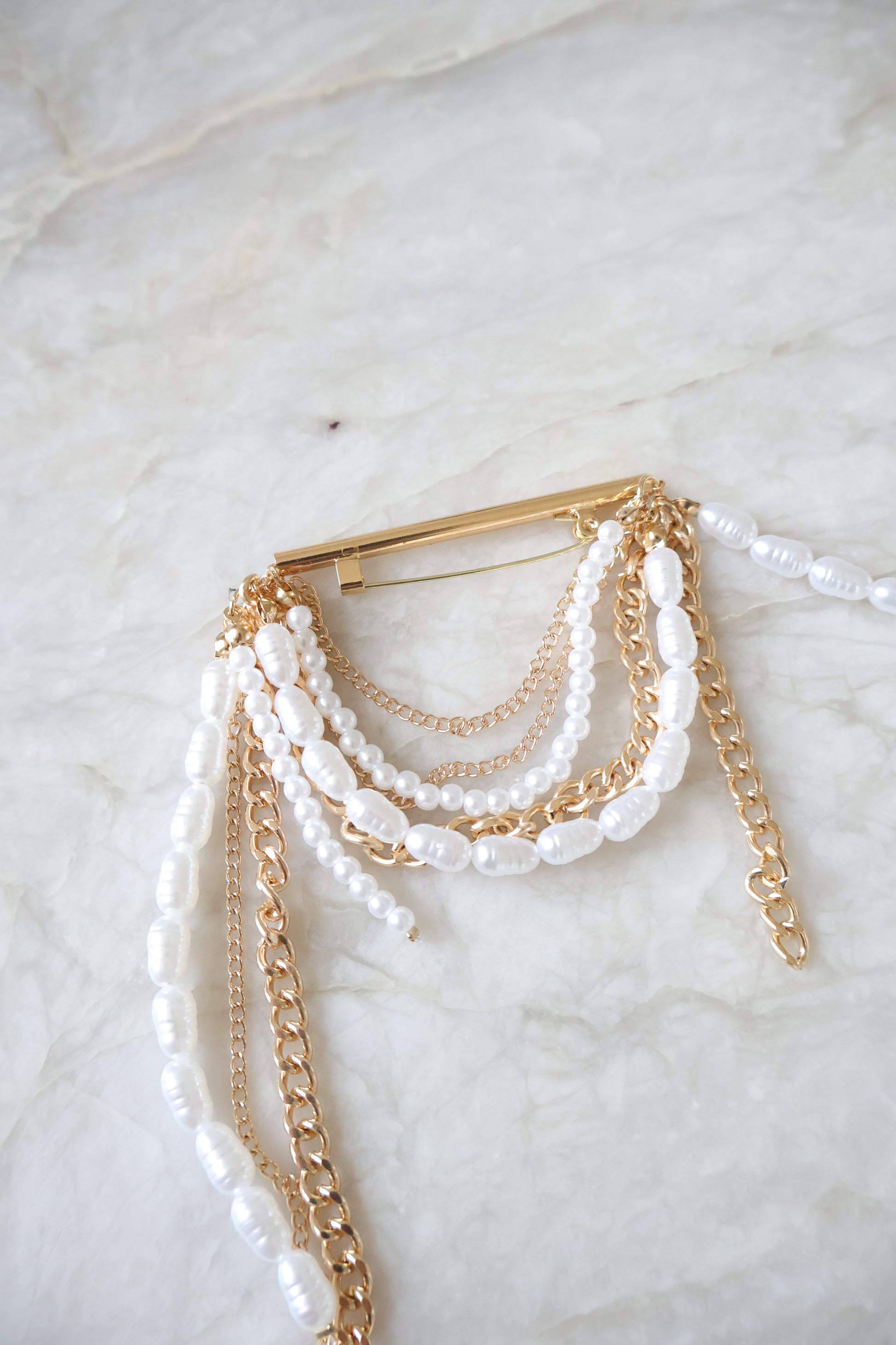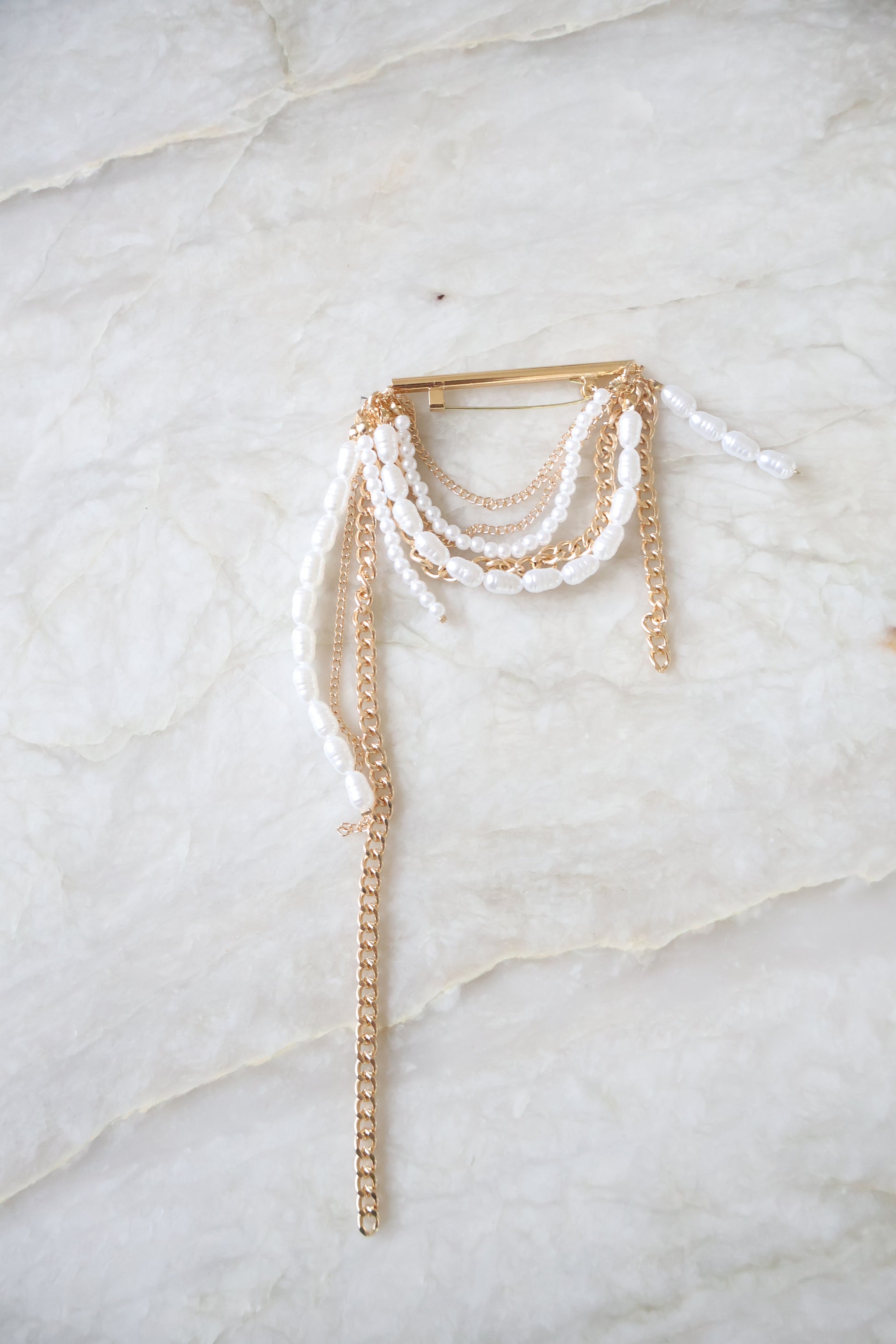 Broche met schakelkettinkjes en parels. Niet geschikt om op dunne stofjes als katoen te dragen.