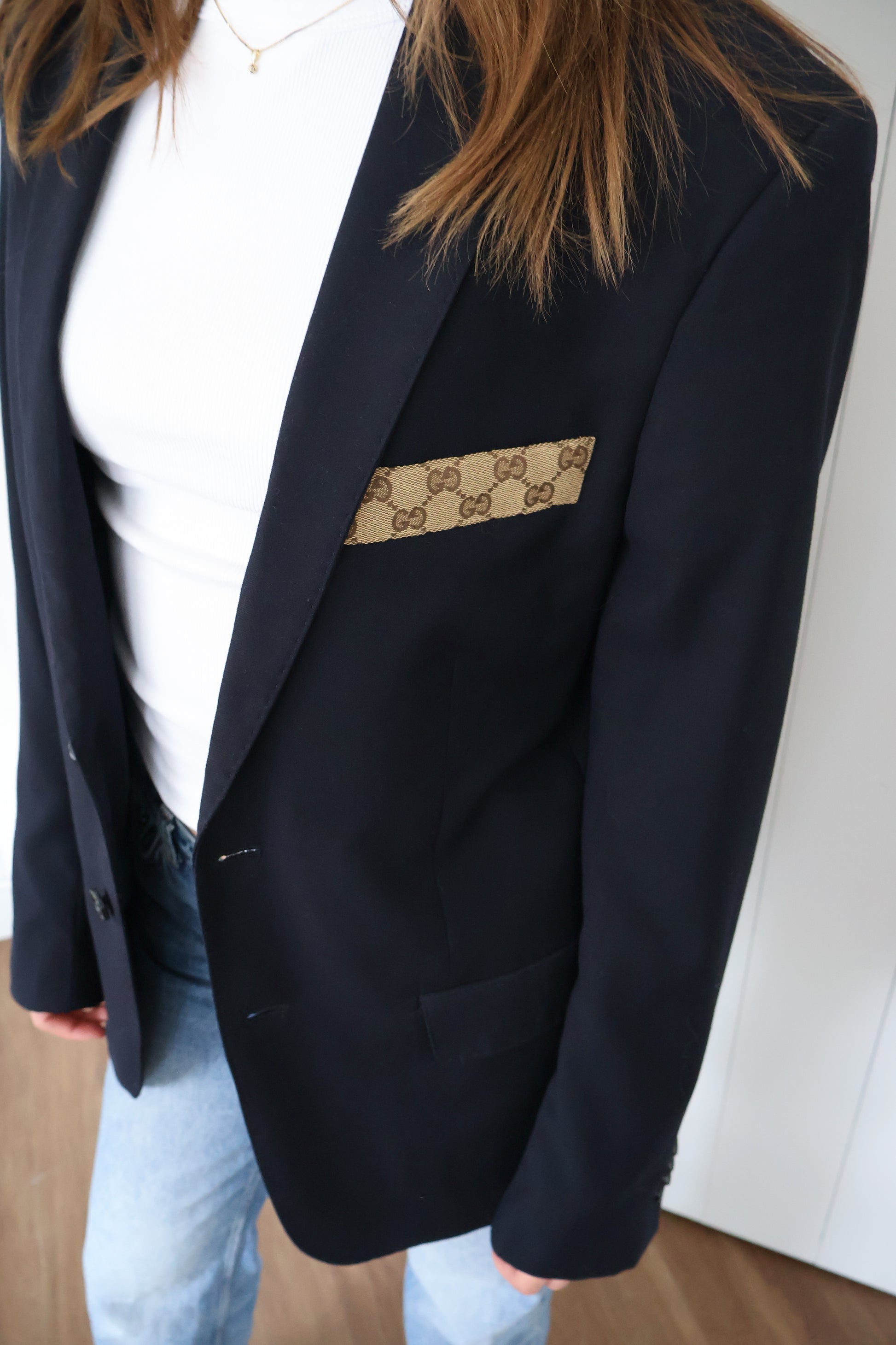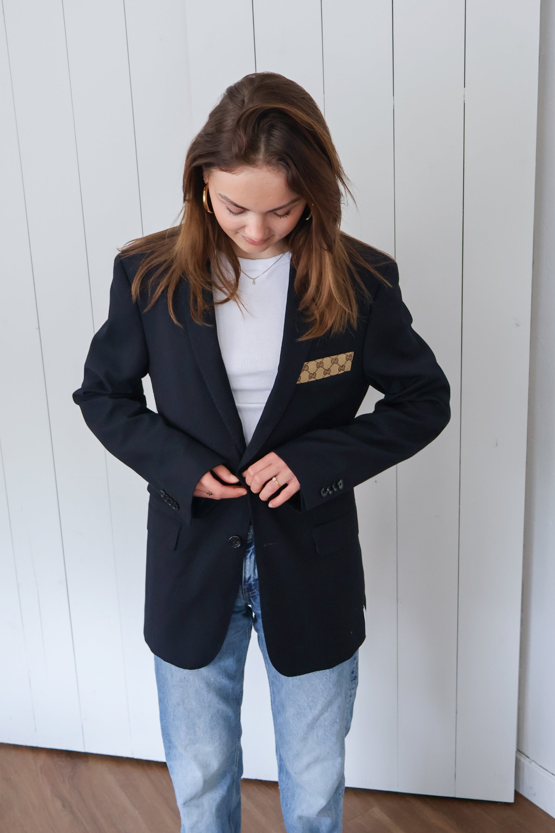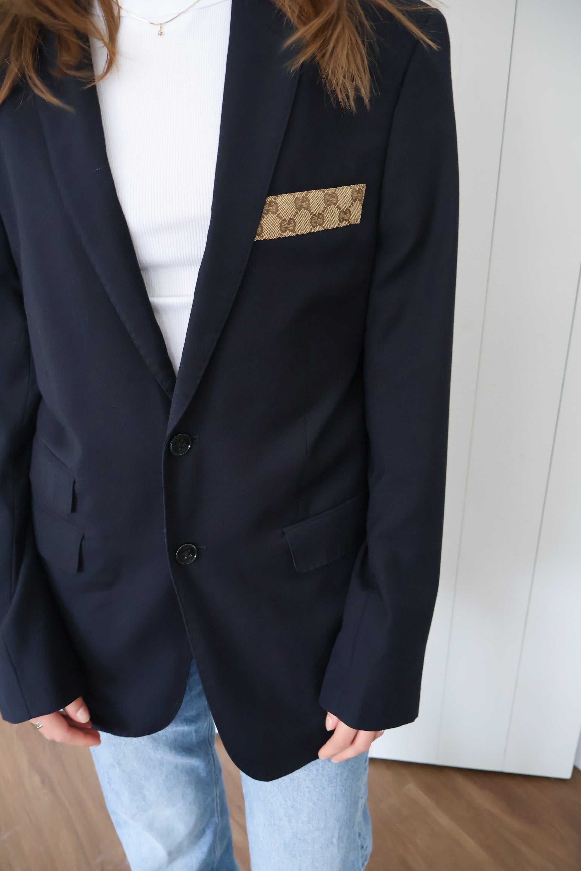 Donkerblauwe blazer met Gucci detail en elastieken band voor een mooi tailored effect