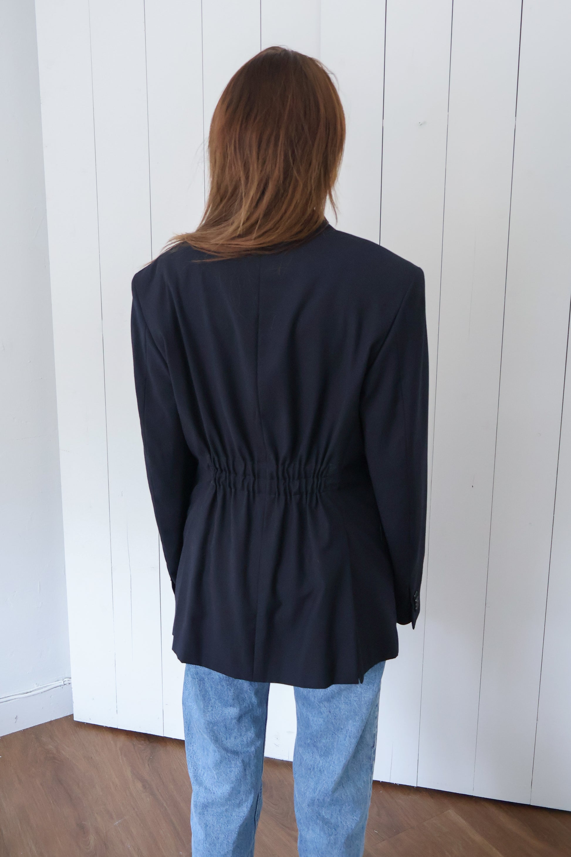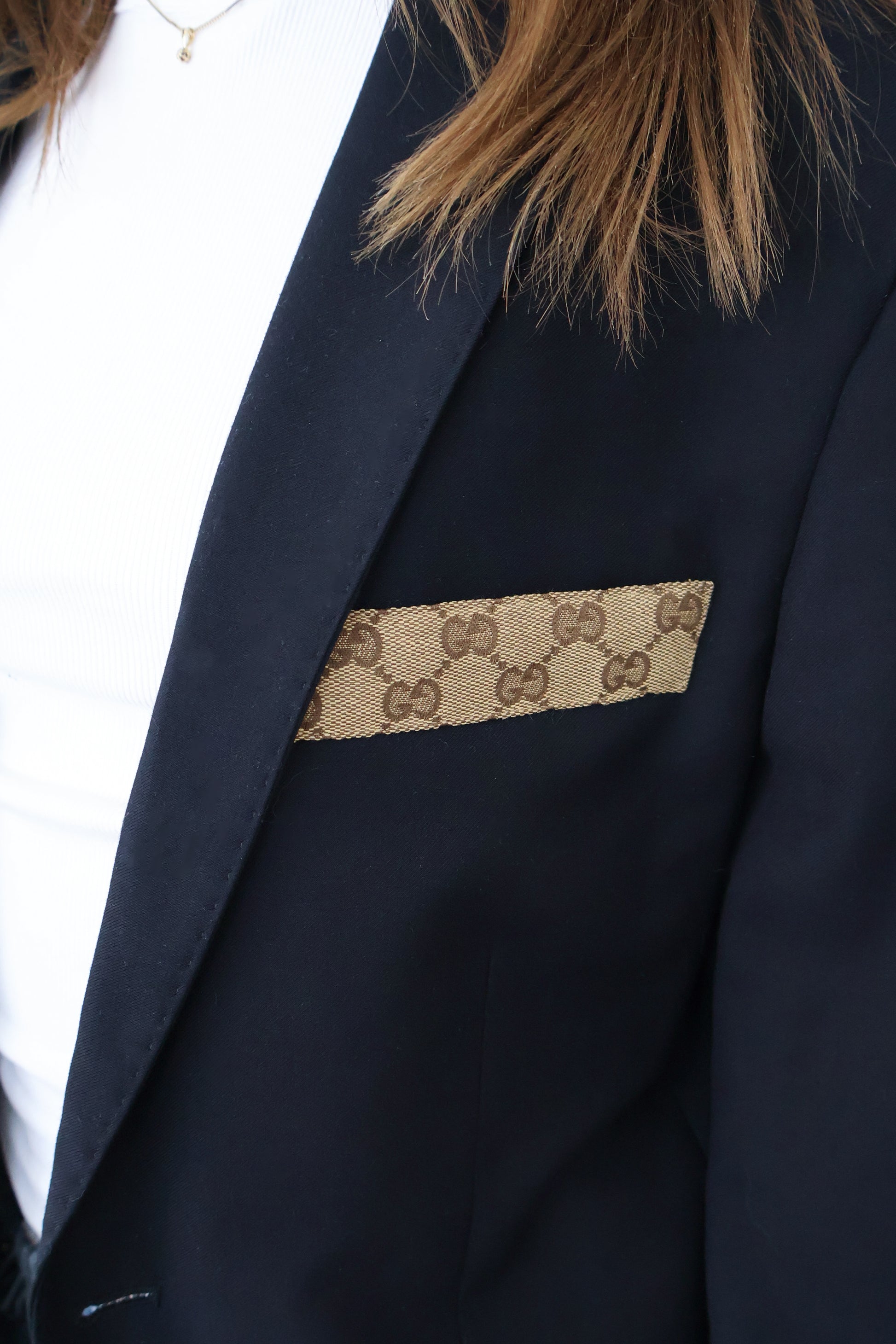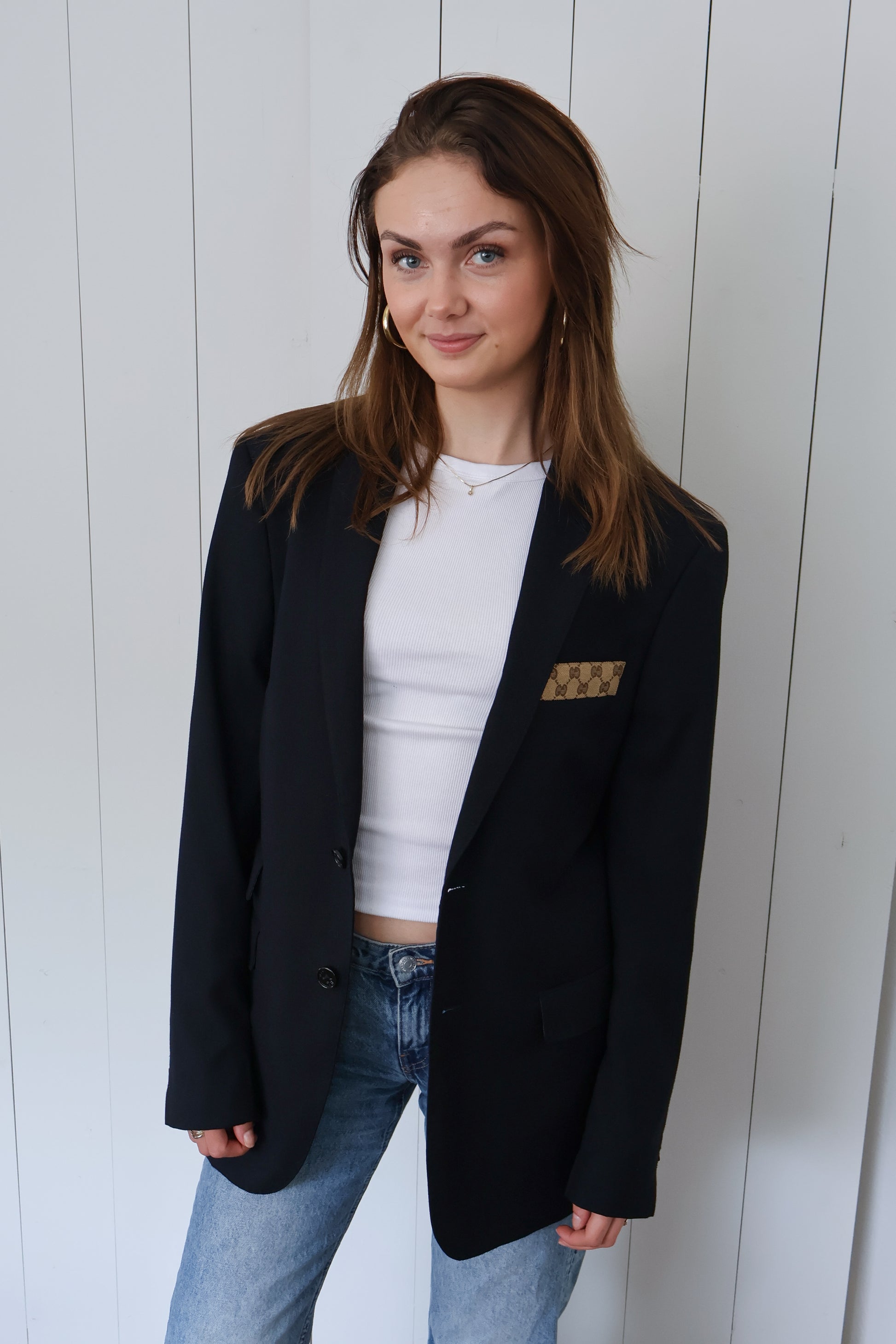 Donkerblauwe blazer met Gucci detail en elastieken band voor een mooi tailored effect