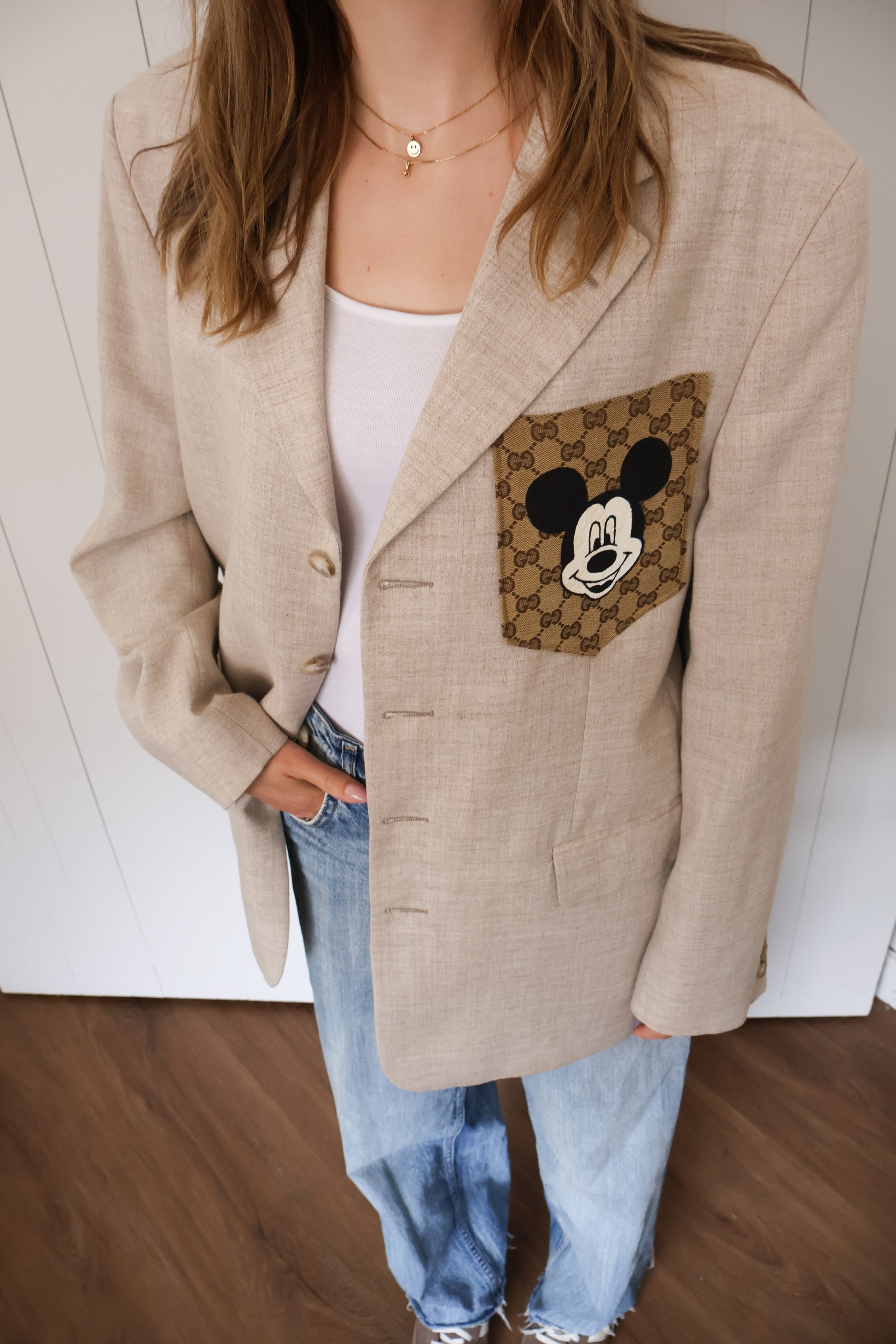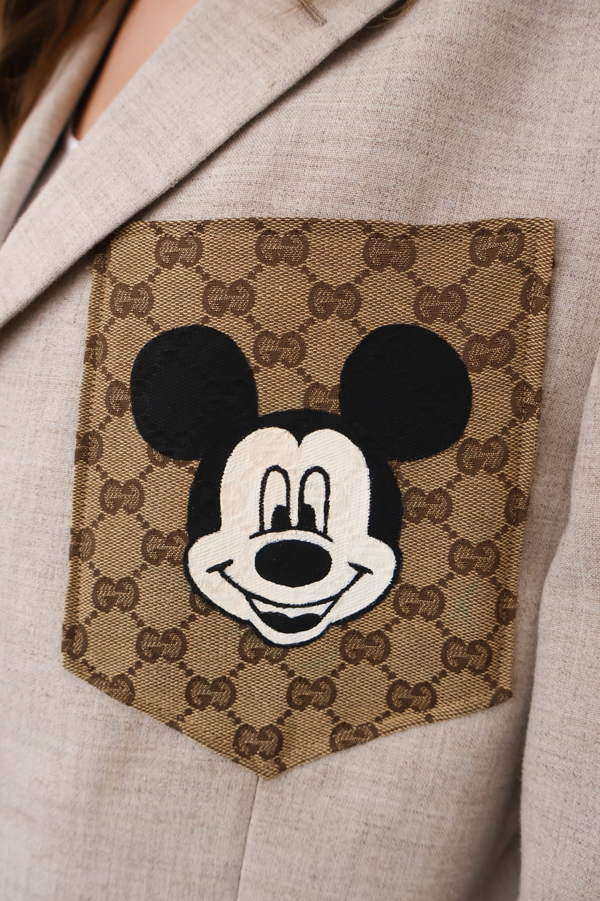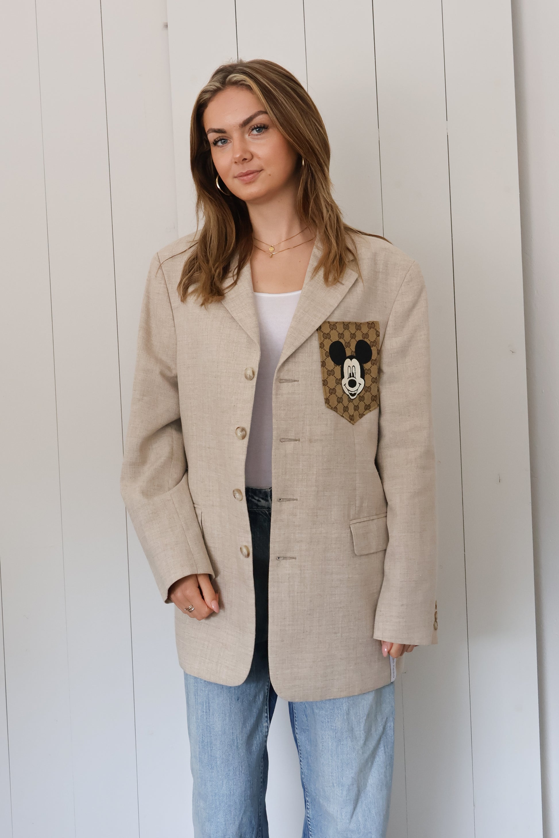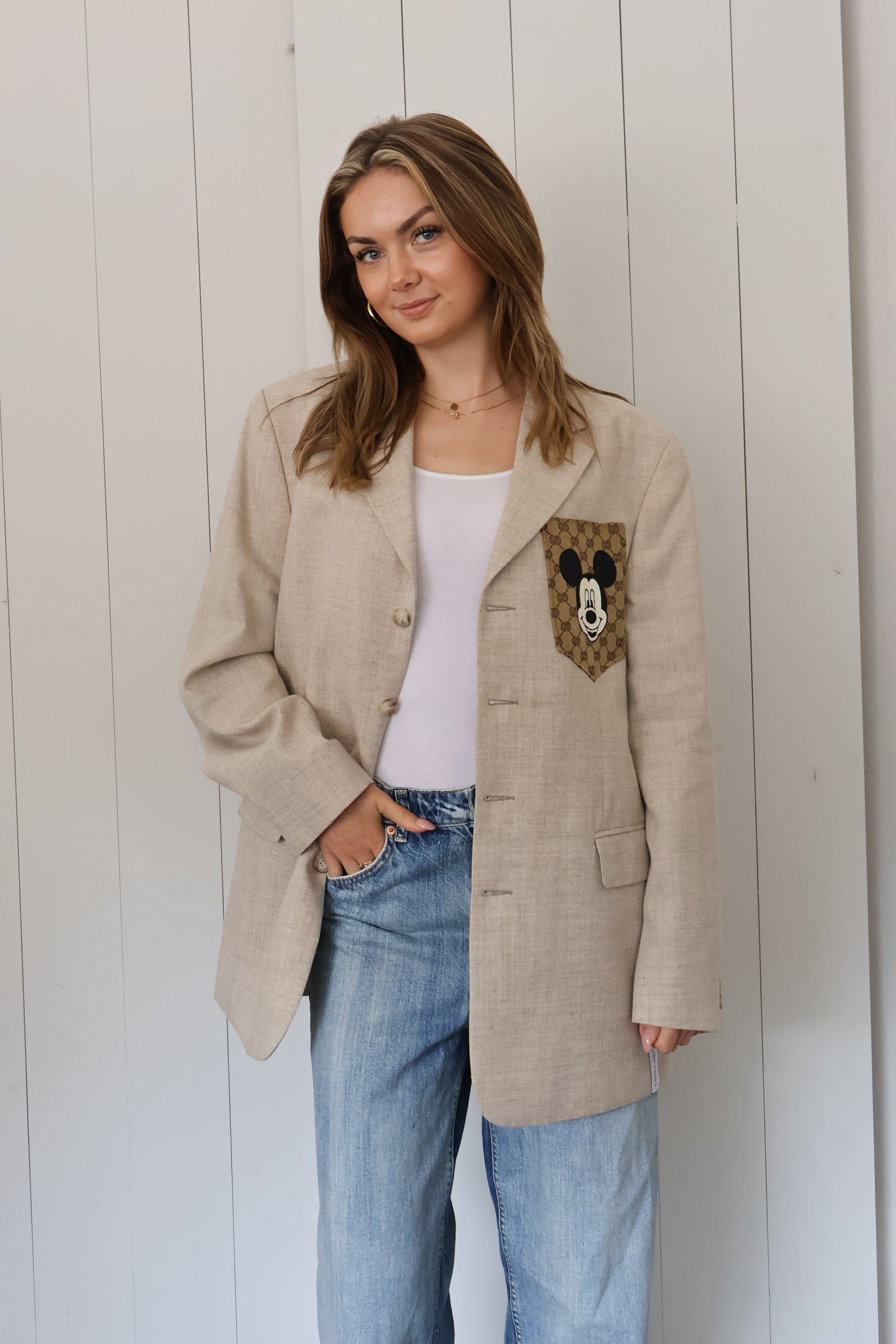 Beige reworked blazer met Gucci detail en handpainted Mickey.