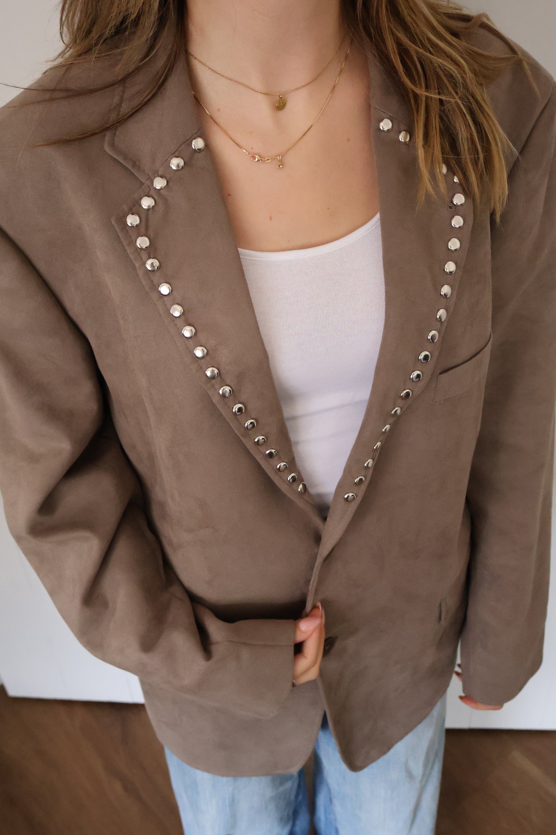 Bruin suède-look blazer met elastiek in de taille en zilveren studs